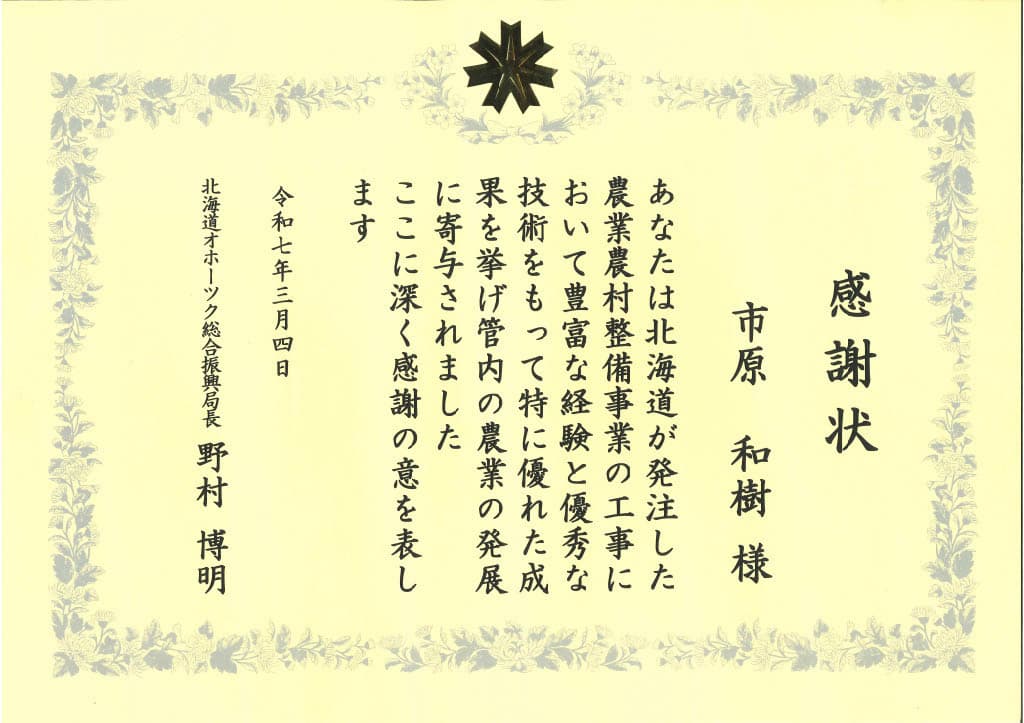 北海道オホーツク総合振興局より感謝状をいただきました。